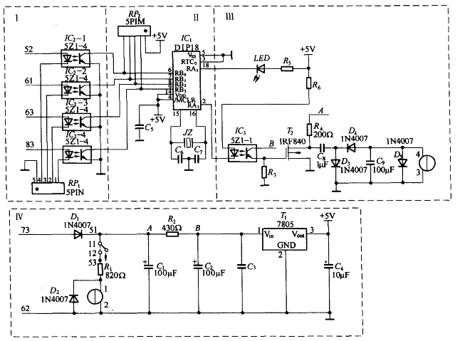 Ⅱ為控制電路,由IC1、(DIP18型)和晶體振蕩器JZ及C6 、C7等組成。JZ為IC1,提供振蕩源。當(dāng)IC1的輸人端RB0一RB3其中一個有輸人時,通過軟件的設(shè)定,其輸出端RA1~RA3在不同的延時時間后就有序列脈沖輸出。在延時過程中發(fā)光二極管LED每秒鐘閃亮一次。